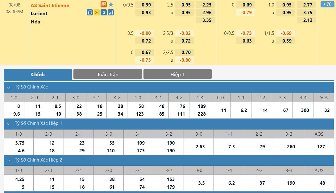 Tỷ lệ kèo cá cược bóng đá trực tuyến trận Saint-Etienne vs Lorient