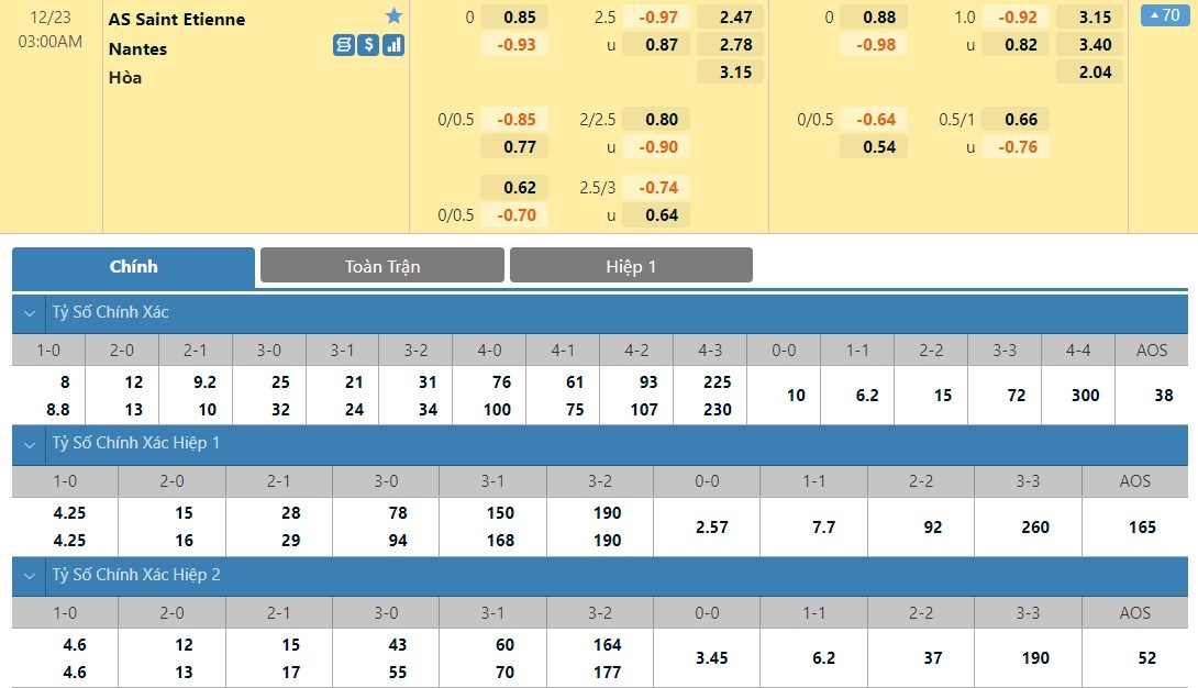 Tỷ lệ kèo cá cược bóng đá trận Saint-Etienne vs Nantes