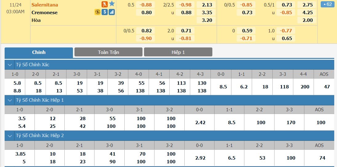 Tỷ lệ kèo cá cược bóng đá trận Salernitana vs Cremonese