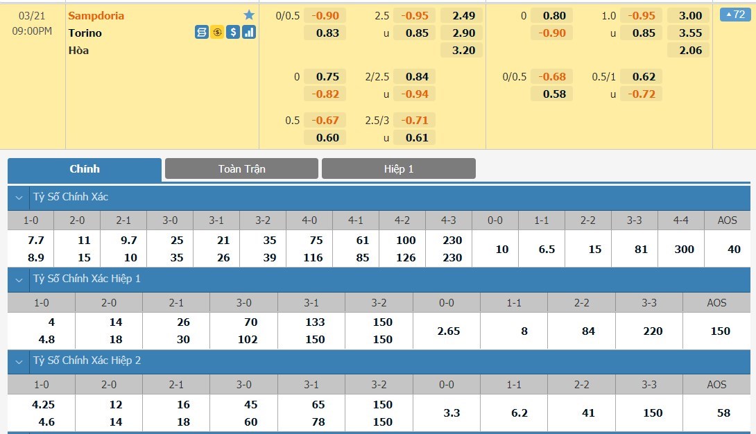 Tỷ lệ kèo cá cược bóng đá trận Sampdoria vs Torino