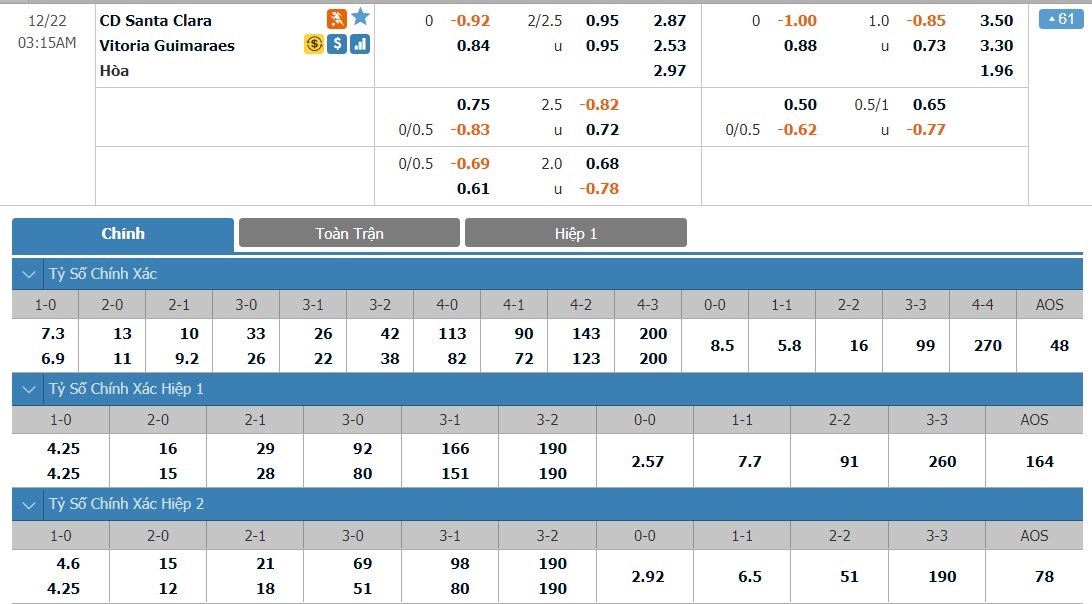 Tỷ lệ kèo cá cược bóng đá trận Santa Clara vs Vitoria Guimaraes