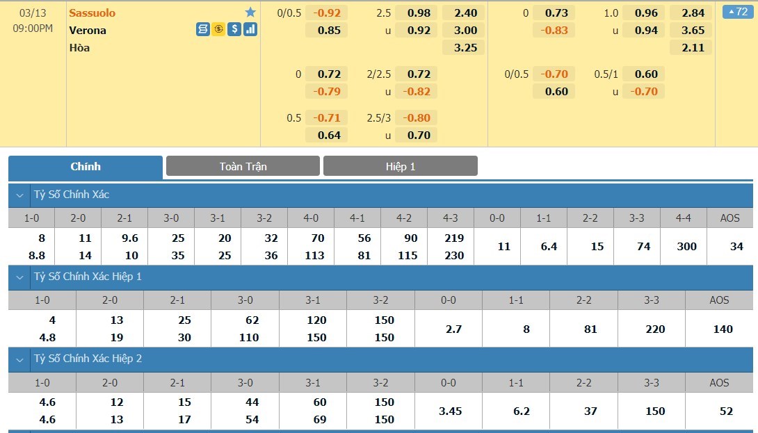 Tỷ lệ kèo cá cược bóng đá trận Sassuolo vs Hellas Verona