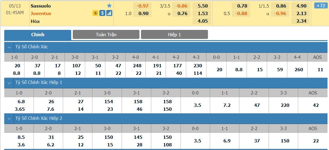 Tỷ lệ kèo cá cược bóng đá trực tuyến trận Sassuolo vs Juventus