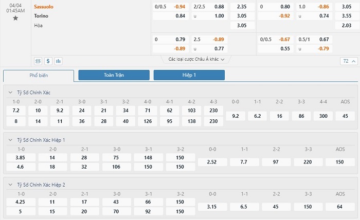 Tỷ lệ kèo cá cược bóng đá trực tuyến trận Sassuolo vs Torino