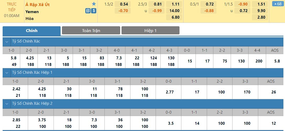 Tỷ lệ kèo cá cược bóng đá trận Saudi Arabia vs Yemen