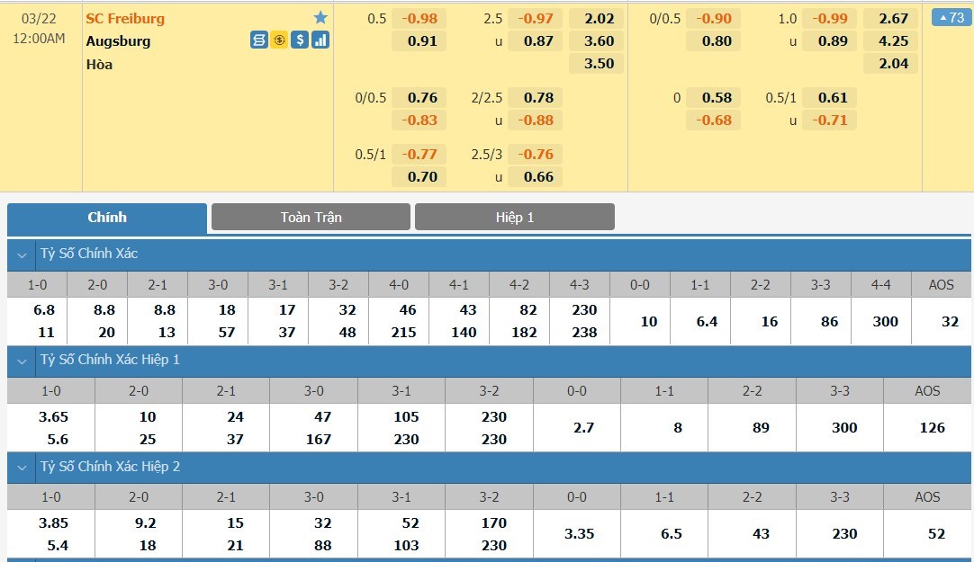 Tỷ lệ kèo cá cược bóng đá trận SC Freiburg vs Augsburg