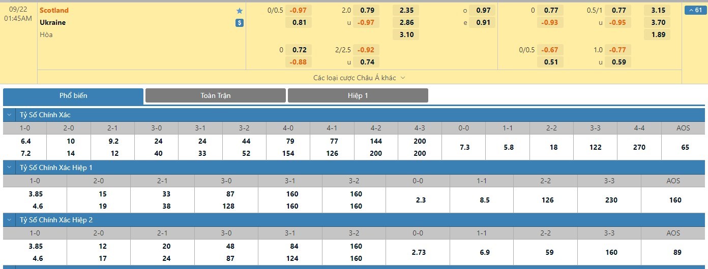 Xem tỷ lệ kèo cá cược bóng đá trực tuyến Scotland vs Ukraine