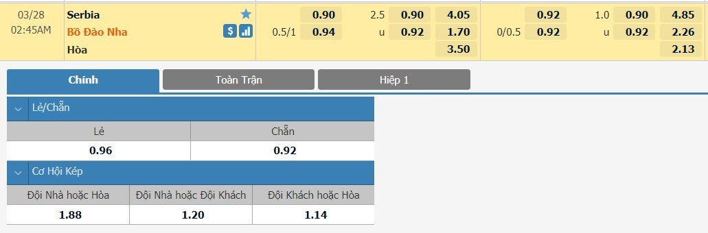 Tỷ lệ kèo cá cược bóng đá trận Serbia vs Bồ Đào Nha