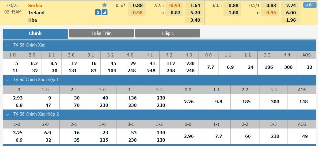 Tỷ lệ kèo cá cược bóng đá trận Serbia vs Ireland