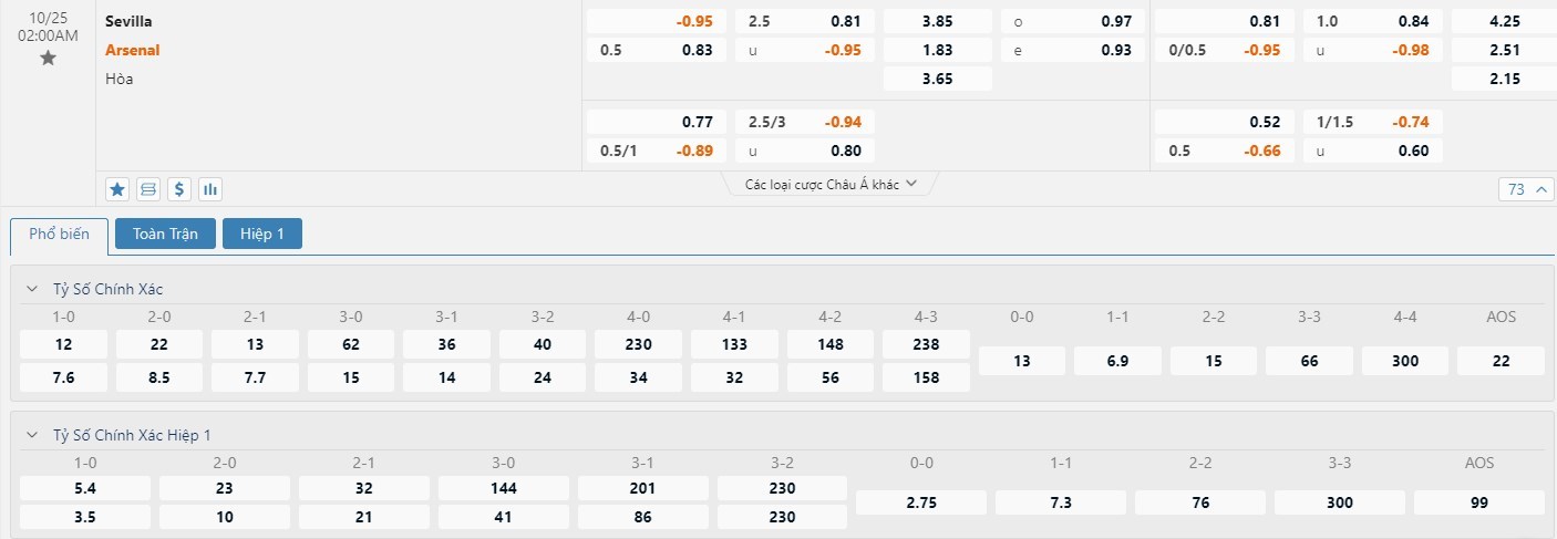 Tỷ lệ kèo cá cược bóng đá trực tuyến trận Sevilla vs Arsenal