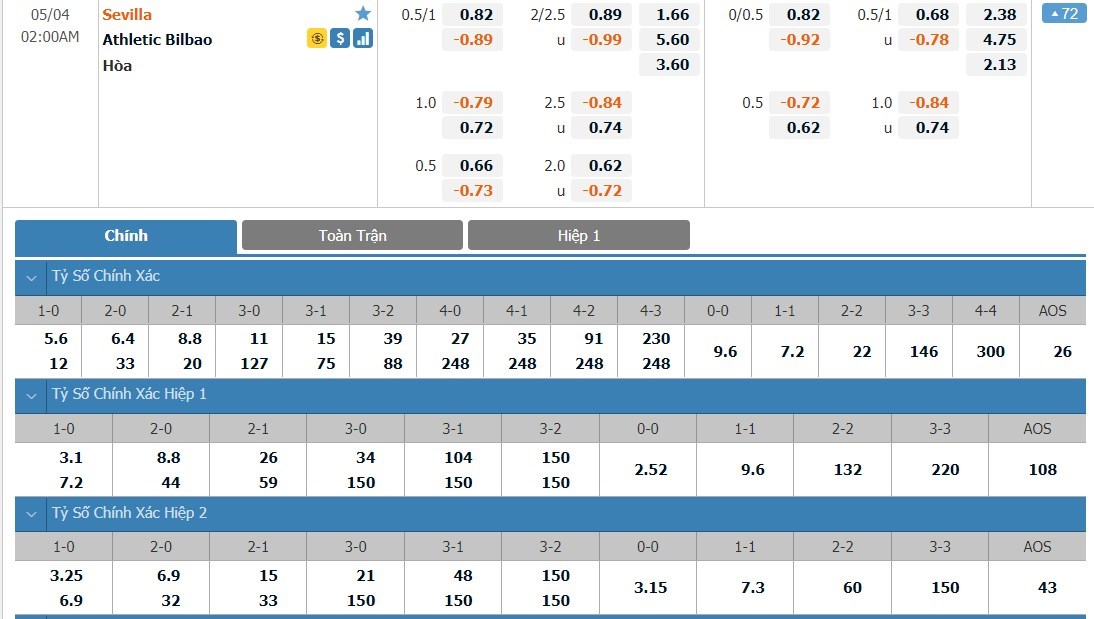 Xem tỷ lệ kèo cá cược bóng đá trực tuyến Sevilla vs Athletic Bilbao