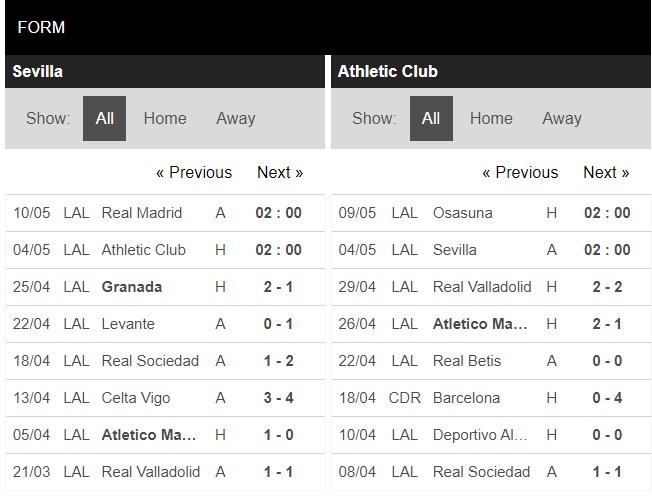 Thống kê phong độ Sevilla vs Athletic Bilbao