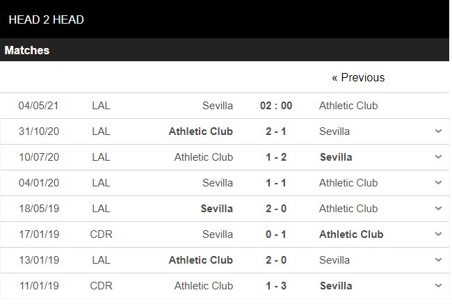 Thống kê đối đầu Sevilla vs Athletic Bilbao