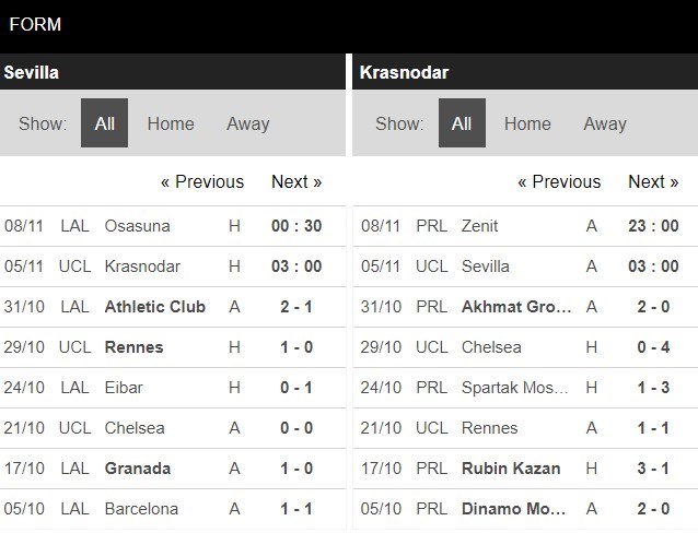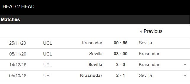 Thống kê đối đầu Sevilla vs FC Krasnodar