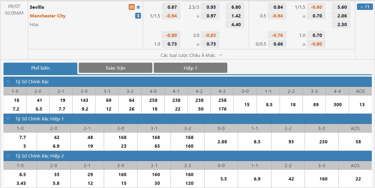 Tỷ lệ kèo cá cược bóng đá trực tuyến trận Sevilla vs Manchester City