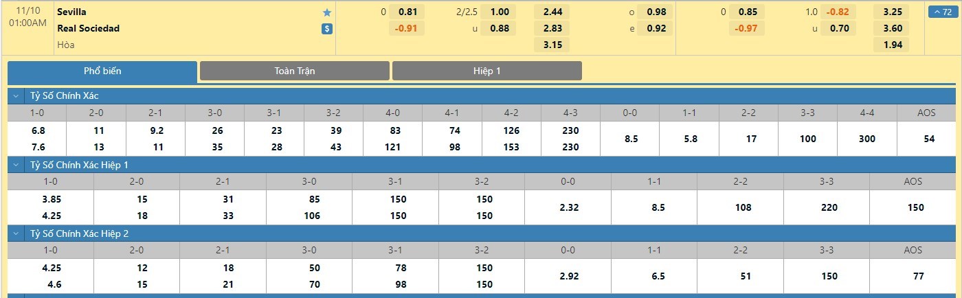 Tỷ lệ kèo cá cược bóng đá trực tuyến trận Sevilla vs Real Sociedad
