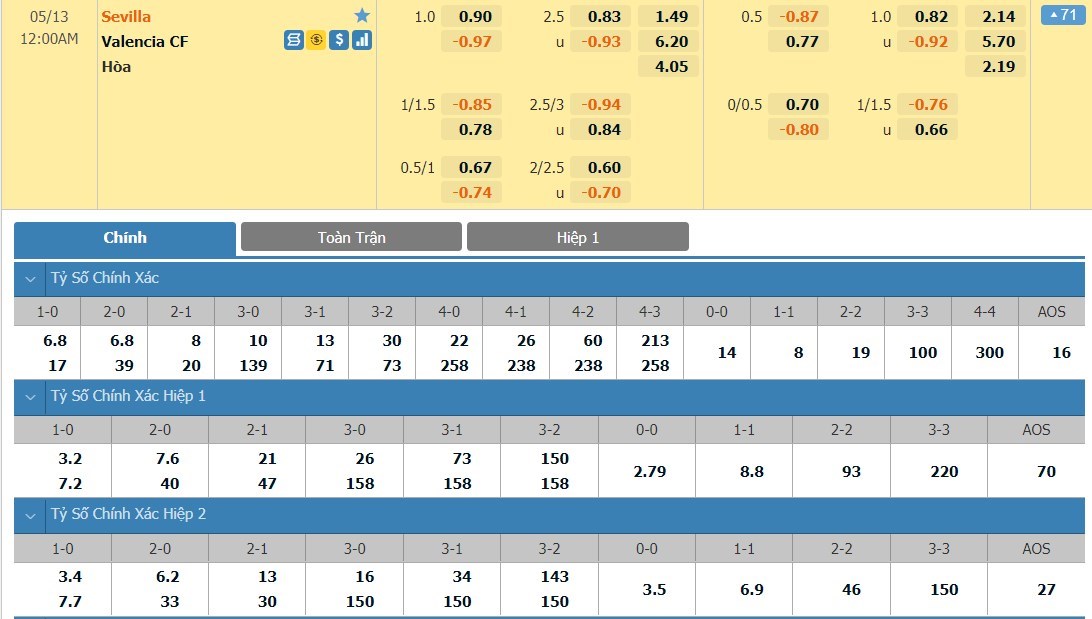 Tỷ lệ kèo cá cược bóng đá trận Sevilla vs Valencia