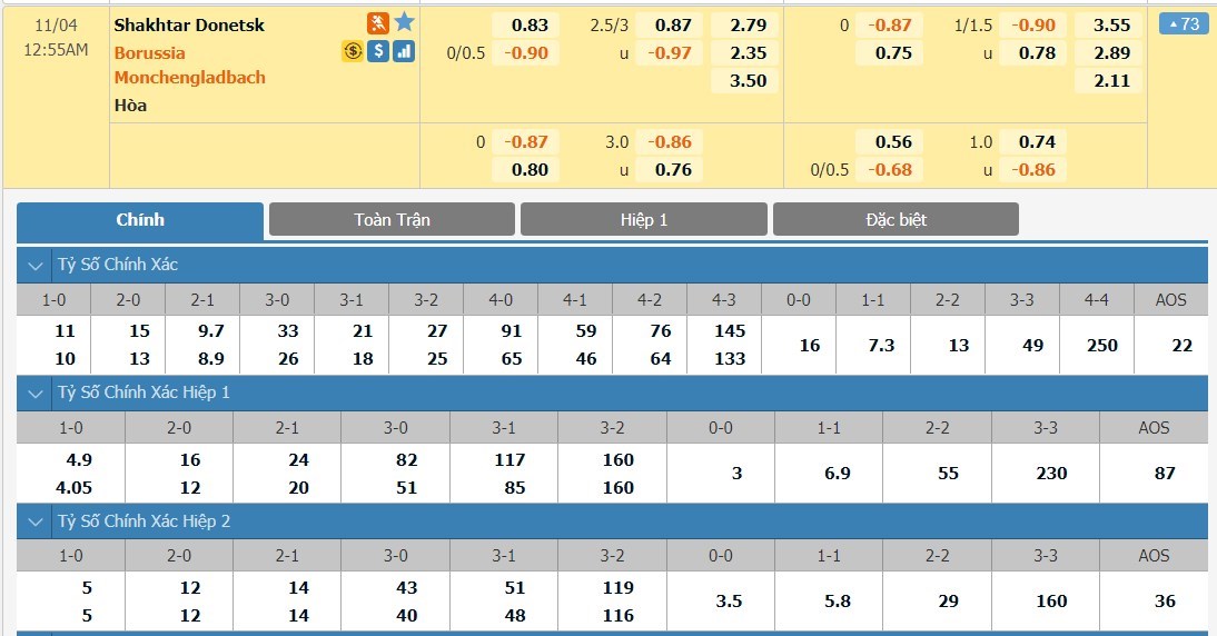 Tỷ lệ kèo cá cược bóng đá trực tuyến trận Shakhtar Donetsk vs Borussia Monchengladbach