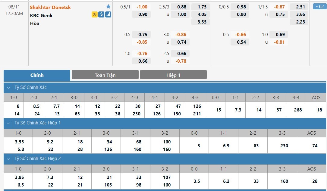 Tỷ lệ kèo cá cược bóng đá trận Shakhtar Donetsk vs Genk
