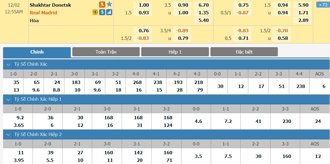 Xem tỷ lệ kèo cá cược bóng đá trực tuyến Shakhtar Donetsk vs Real Madrid