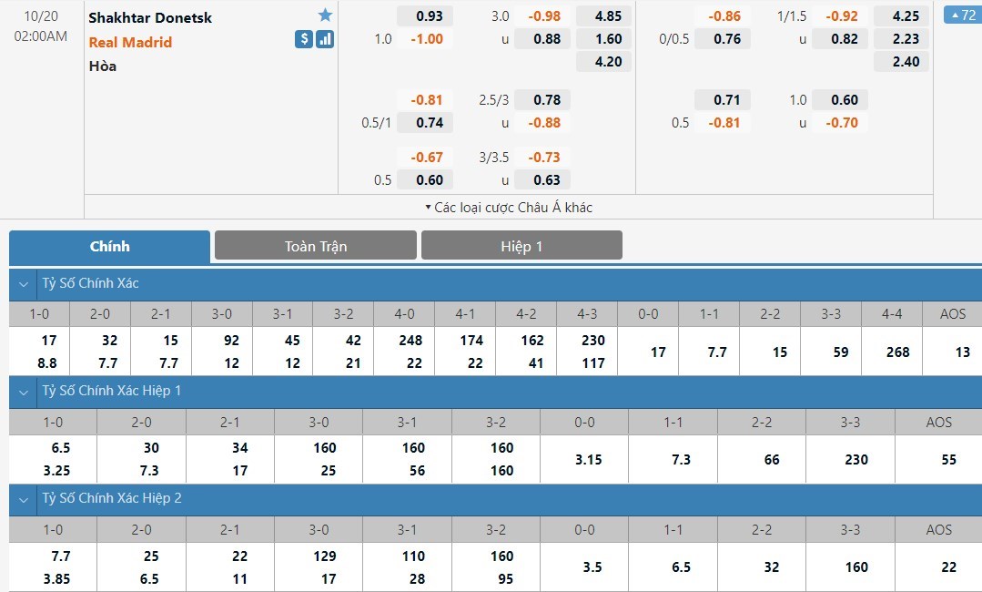 Tỷ lệ kèo cá cược bóng đá trực tuyến trận Shakhtar Donetsk vs Real Madrid
