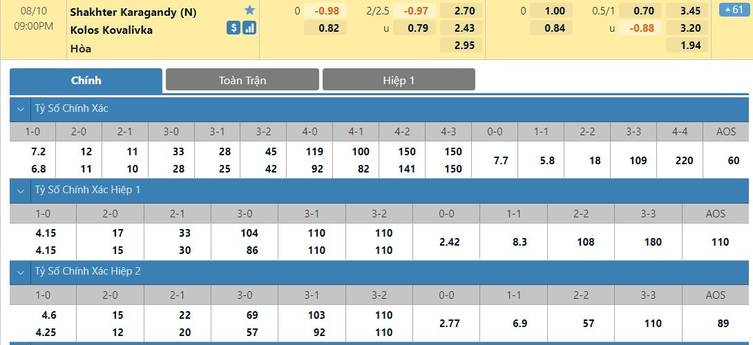 Tỷ lệ kèo cá cược bóng đá trực tuyến trận Shakhter Karagandy vs Kolos Kovalivka