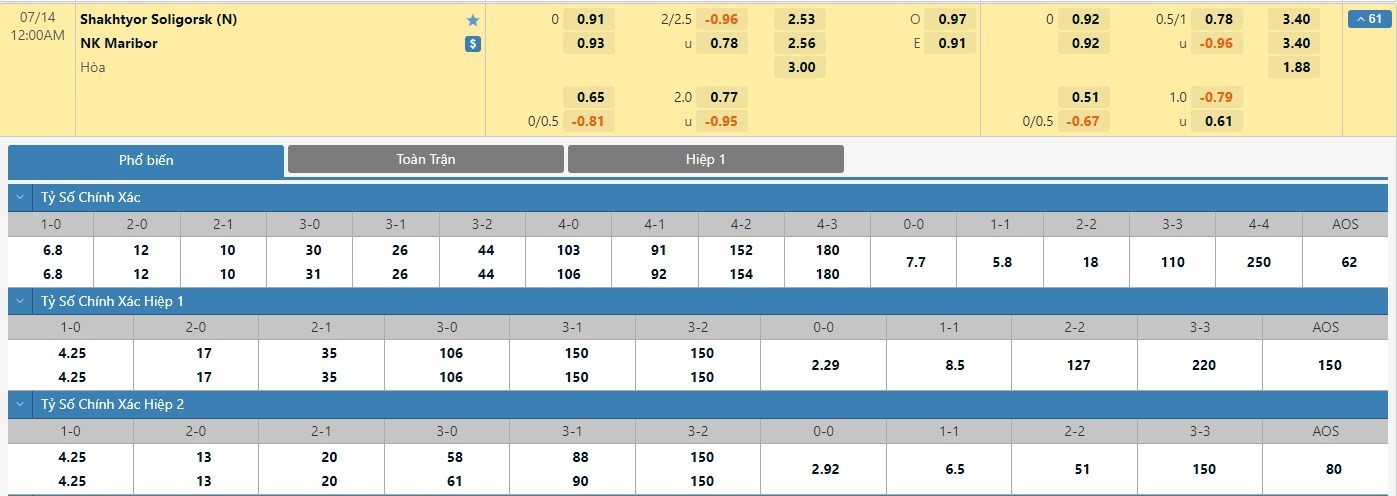 Tỷ lệ kèo cá cược bóng đá trận Shakhtyor Soligorsk vs Maribor