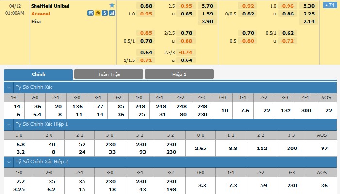 Xem tỉ lệ kèo cá cược bóng đá trực tuyến Sheffield United vs Arsenal