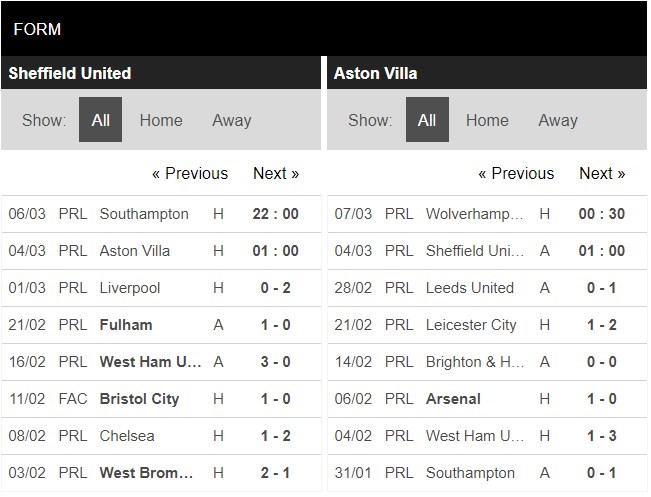 Thống kê phong độ Sheffield United vs Aston Villa