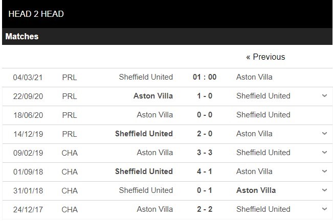 Thống kê đối đầu Sheffield United vs Aston Villa