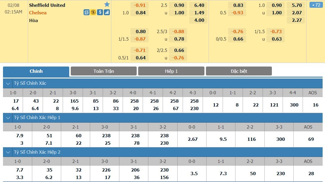 Xem tỷ lệ kèo cá cược bóng đá trực tuyến Sheffield United vs Chelsea