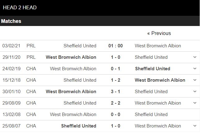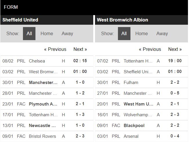 Thống kê đối đầu Sheffield United vs West Bromwich
