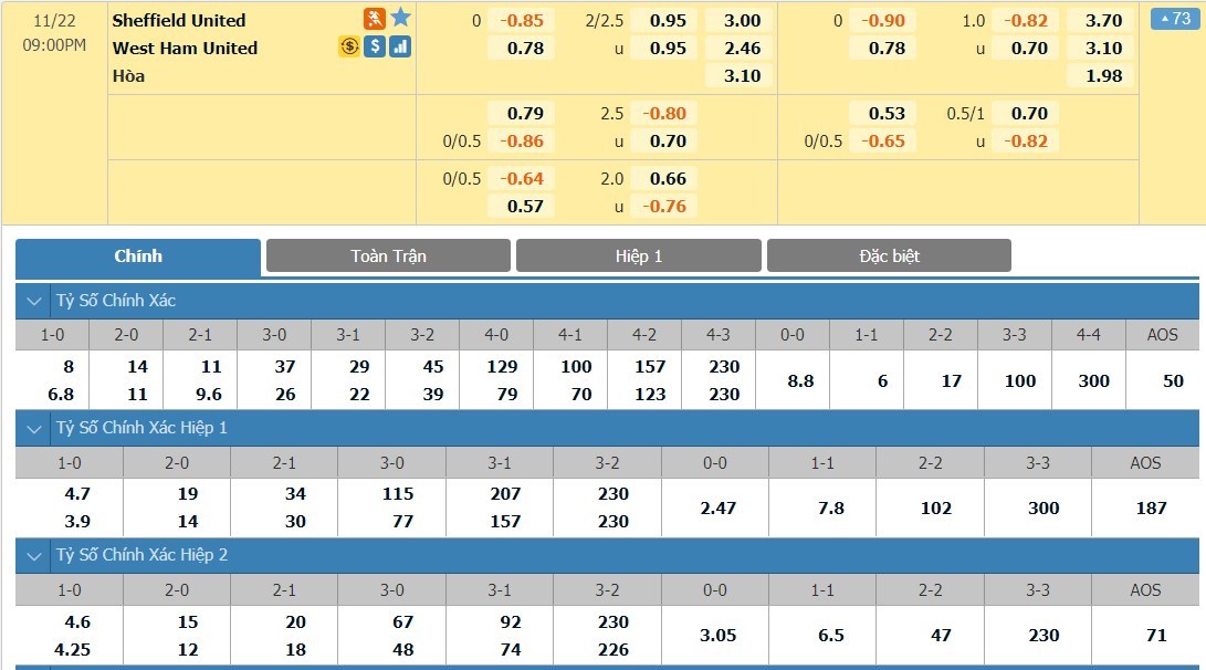 Tỷ lệ kèo cá cược bóng đá trực tuyến trận Sheffield United vs West Ham United