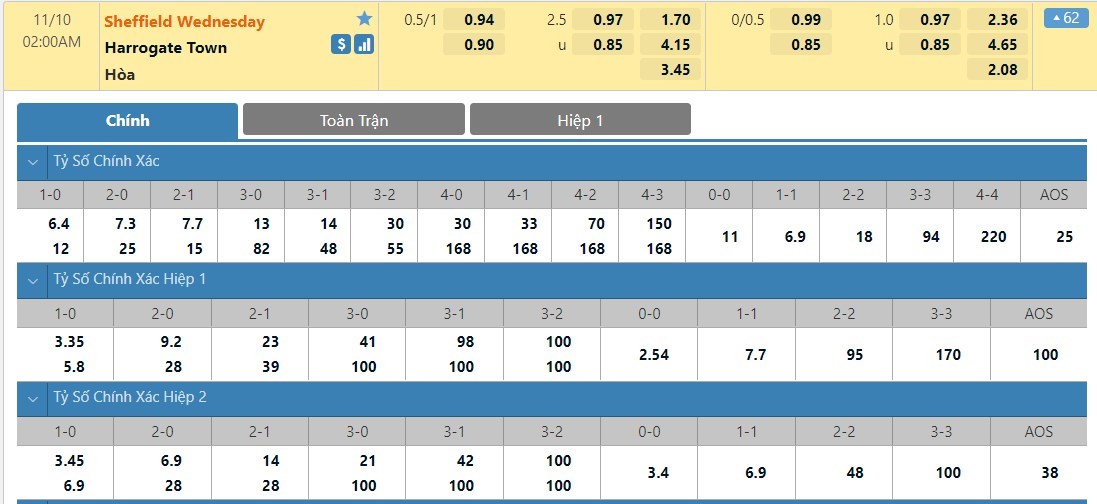 Tỷ lệ kèo cá cược bóng đá trực tuyến trận Sheffield Wednesday vs Harrogate
