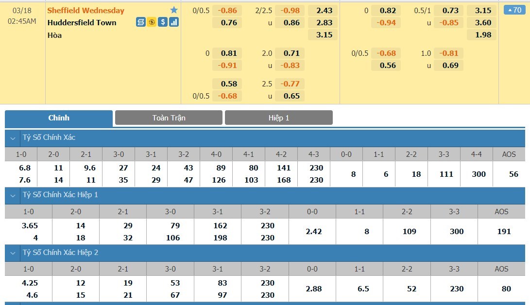 Tỷ lệ kèo cá cược bóng đá trận Sheffield Wednesday vs Huddersfield