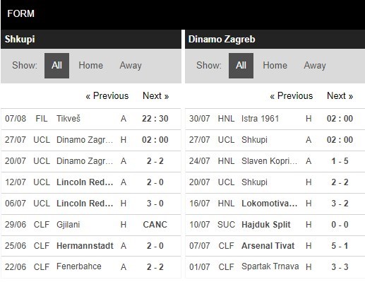 Thống kê phong độ Shkupi vs Dinamo Zagreb