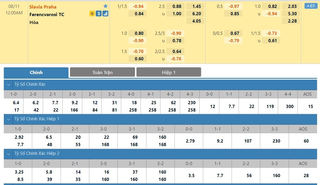 Tỷ lệ kèo cá cược bóng đá trực tuyến trận Slavia Praha vs Ferencvaros