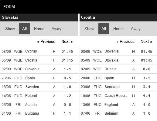Trong 5 lần đối đầu, Croatia chưa thua Slovakia, thắng tới 4 trận. Tuy vậy, với phong độ hiện tại của Croatia thì không có điều gì là chắc chắn về một chiến thắng. Trong 20 trận gần nhất, tỉ lệ thắng kèo của Croatia chỉ là 30%. Trong khi đó, Slovakia chỉ thắng chuyên môn 2/10 trận gần nhất nhưng cũng đạt thành tích thắng kèo đến 40%.