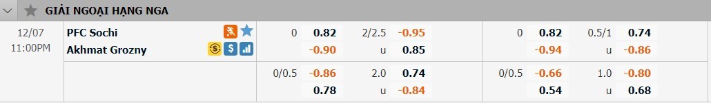 Tỷ lệ kèo cá cược bóng đá trận Sochi vs Akhmat Grozny