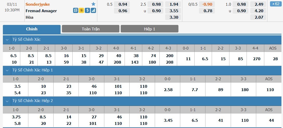 Tỷ lệ kèo cá cược bóng đá trận SonderjyskE vs Fremad Amager