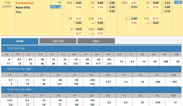 Xem tỉ lệ kèo cá cược bóng đá trực tuyến Southampton vs Aston Villa