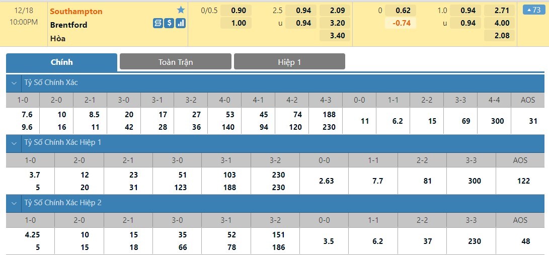 Tỷ lệ kèo cá cược bóng đá trận Southampton vs Brentford