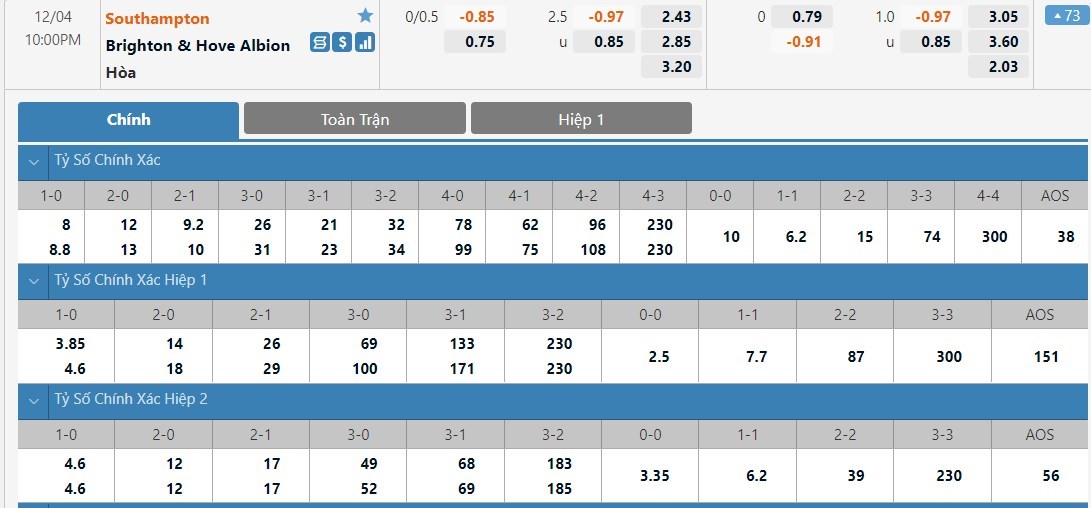 Tỷ lệ kèo cá cược bóng đá trận Southampton vs Brighton