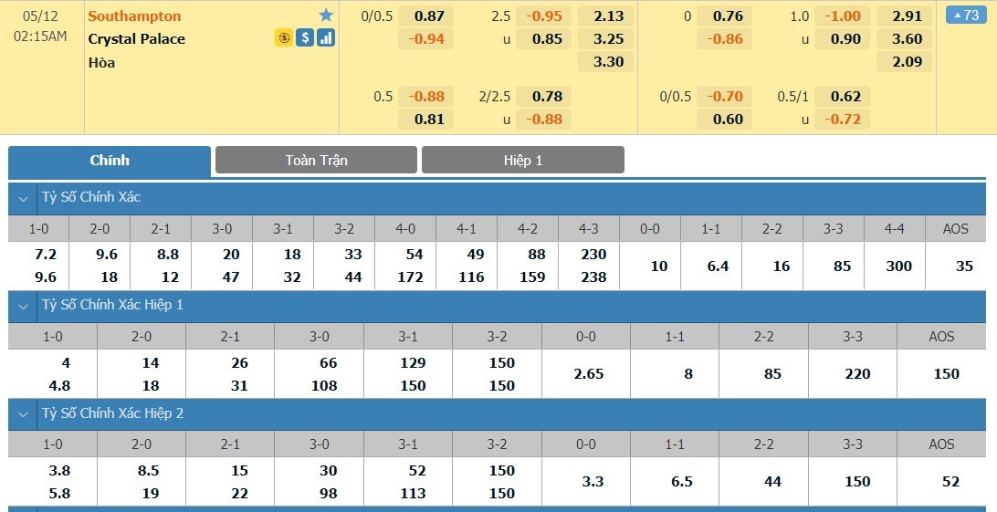 Xem tỷ lệ kèo cá cược bóng đá trực tuyến Southampton vs Crystal Palace