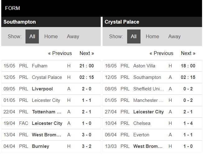 Thống kê phong độ Southampton vs Crystal Palace