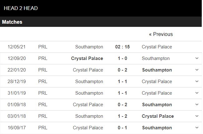 Thống kê đối đầu Southampton vs Crystal Palace