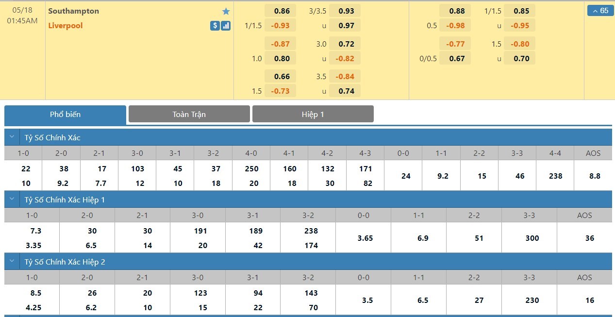 Xem tỷ lệ kèo cá cược bóng đá trực tuyến Southampton vs Liverpool