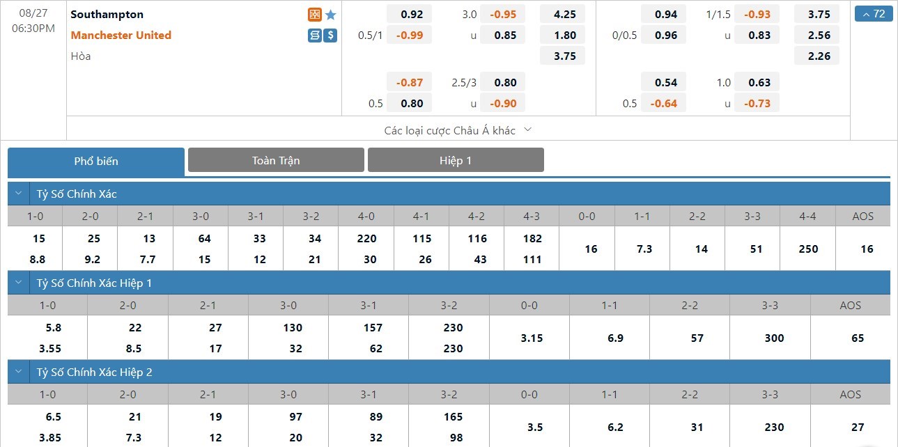 Xem tỷ lệ kèo cá cược bóng đá trực tuyến Southampton vs Manchester United