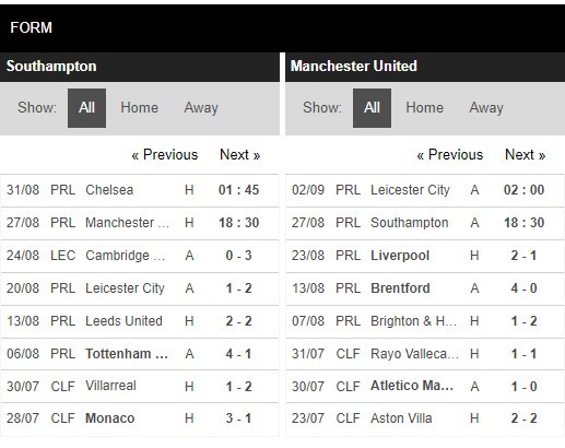 Thống kê phong độ Southampton vs Manchester United