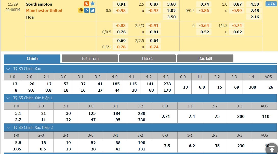 Tỷ lệ kèo cá cược bóng đá trực tuyến trận Southampton vs Manchester United